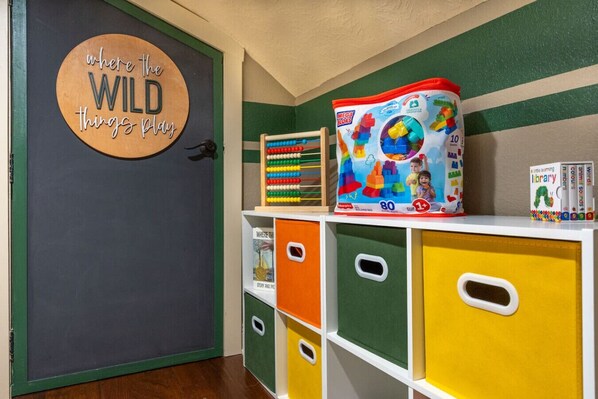 • Media/Game Room (Upstairs) – Queen pull-out sofa, access to futon room, hidden campout room, kids’ play nook