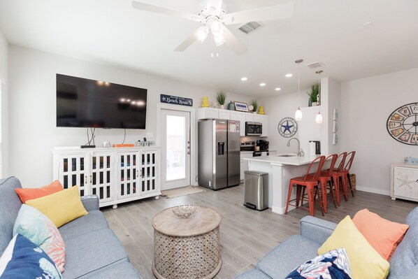 Shell Yeah offers the perfect mix of space, comfort, and coastal charm for families or groups. Pet-friendly and just a short stroll from the beach, this two-story townhome has everything you need for a relaxing North Padre Island getaway, from a fully equipped kitchen to private patios and stunning pool views.
