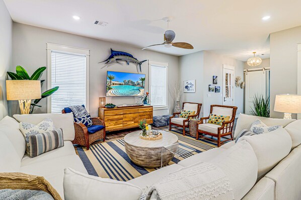 This two-story open concept home invites you in with 10-foot ceilings and high-end décor, connecting the living, kitchen, and dining for a welcoming space to spend time together. Gather in comfort and style in this spacious, open, and well-lit living area, allowing a wonderful place for large family gatherings and entertainment. Enjoy the 65-inch smart TV, great for movie watching or enjoying a sporting event, and many board games and cards that will keep all entertained.