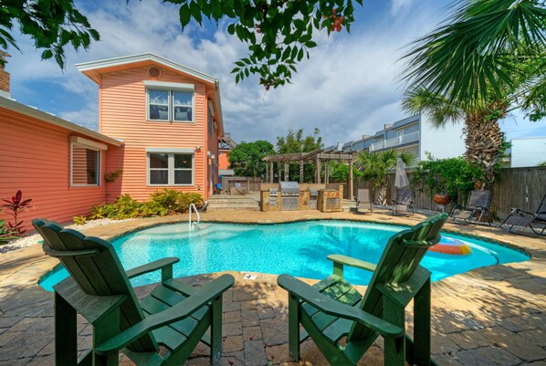 Step outside and let the rhythm of coastal living take over. A sparkling private pool, koi pond, and wooden boardwalk offer moments of reflection, while the grill, lounge seating, and pergola-covered area are ideal for golden hour gatherings. Whether you're sipping coffee under the palms or watching the sunset with friends, The Koi Marlin invites you to slow down, connect, and soak it all in.