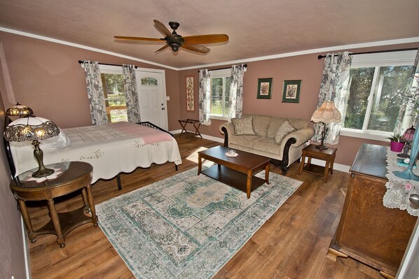 The property is home to many animals; we have sweet one dog Molly; she is not allowed inside the Suites. We also have several geese and chickens that roam the back lot. The geese and chickens, as well as the dogs, are not allowed inside the garden area.