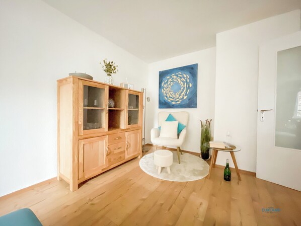 Tämä 50 neliön huoneisto, jossa on makuuhuone ja olohuone vuodesohvalla, mahtuu jopa 4 henkilöä. Vaaleansininen olohuone, jossa mukava sohva ja iso tv kutsuu rentoutumaan. Keittiö, joka on varustettu kaikilla tavallisilla keittiövälineillä, tarjoaa kaikille hauskaa kokata lomalla. Keittiö koostuu muun muassa uunista, pakastimesta ja keraamisesta liesistä. Huoneistossa on tietysti myös ilmainen WiFi. Kauniisti sisustetussa kylpyhuoneessa on suihku ja wc kattoikkunalla. Taloon kuuluvassa puutarhassa on puutarhakalusteet ja grillausmahdollisuus. Se on noin 400m Grimmerhörnbuchtiin, kaupat ovat lähellä.