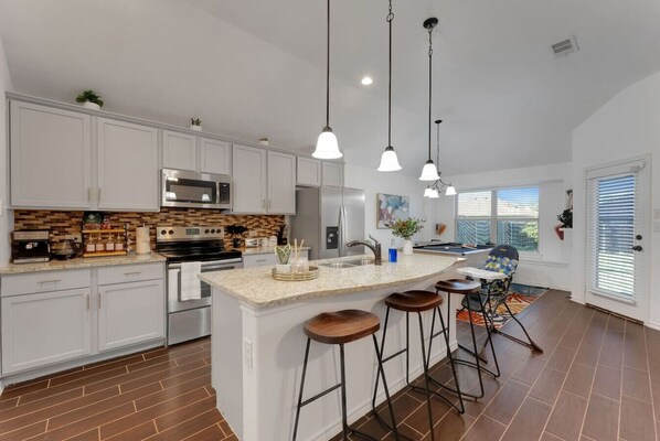 A fully equipped kitchen with modern appliances, complemented by a convenient coffee bar.