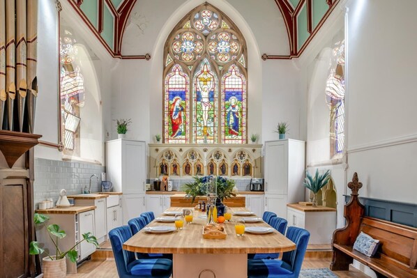 From the moment you step through the original church porch, you’re immersed in style and character. With underfloor heating, soaring vaulted ceilings, and stunning stained glass casting rainbow light across the interiors, this is no ordinary holiday let. The heart of the home is the jaw-dropping open-plan lounge, kitchen and dining area in the former nave. Prepare meals in the well-equipped kitchen set beneath an enormous arched window, then gather around the long oak dining table – framed by original pews, organ pipes and architectural details that celebrate the building’s sacred past. The ground floor also features a handy utility room and a striking reception hall with a rose window and a sweeping staircase. Upstairs, the first floor boasts two elegant king-size bedrooms (one with an en-suite bathroom) and a family bathroom, as well as a dramatic galleried landing with views across the church interior. On the top floor, you'll find two more beautiful king-size bedrooms – both with en-suite shower rooms and one with a mezzanine and sofa bed perfect for children – as well as a spacious triple room. Head outside into your private outdoor oasis. Enjoy al fresco dining in the outdoor kitchen, complete with a ceramic BBQ. Soak in the hot tub under the stars or let the kids blow off steam on the lawn. Ample driveway parking is provided.