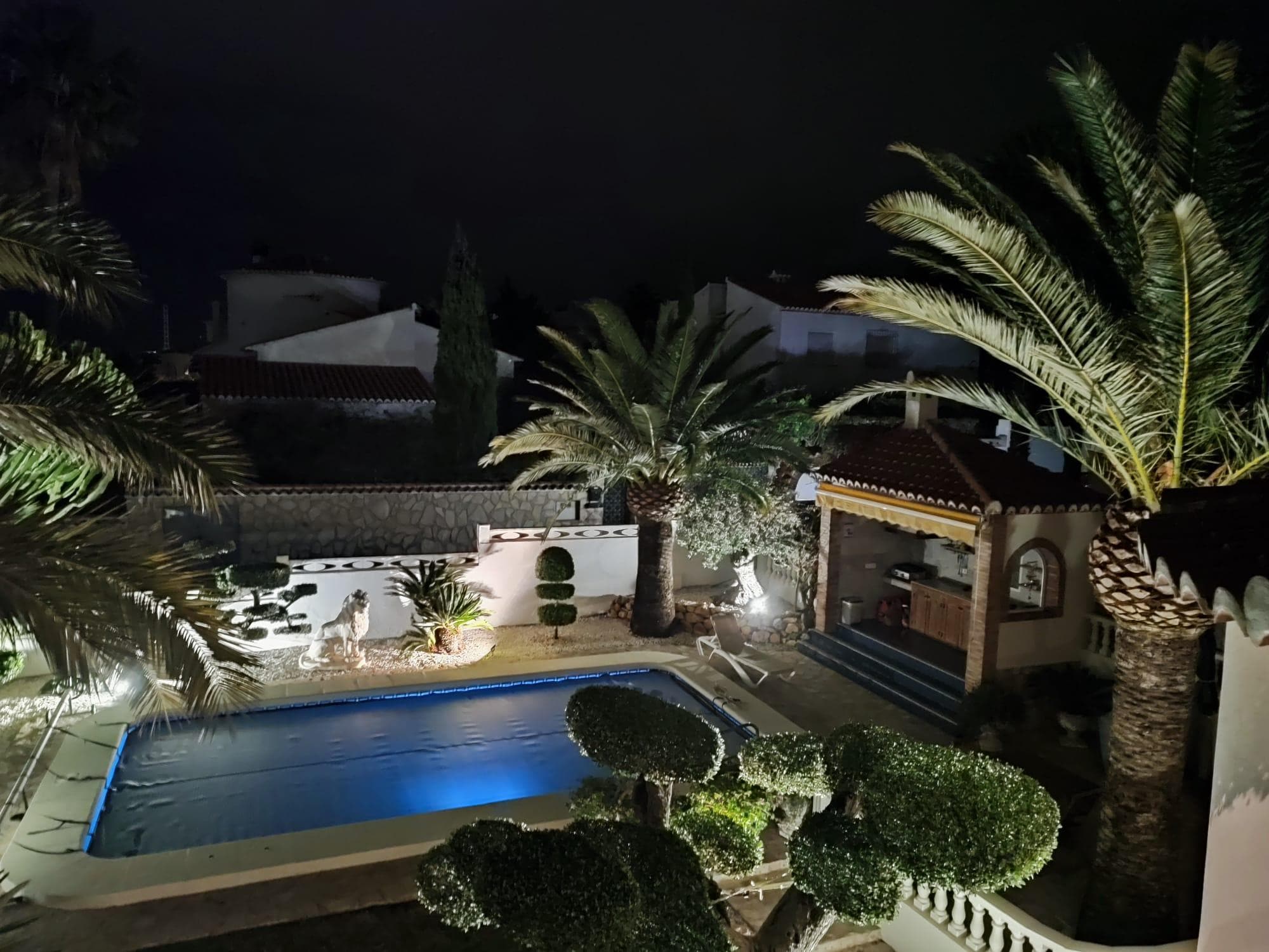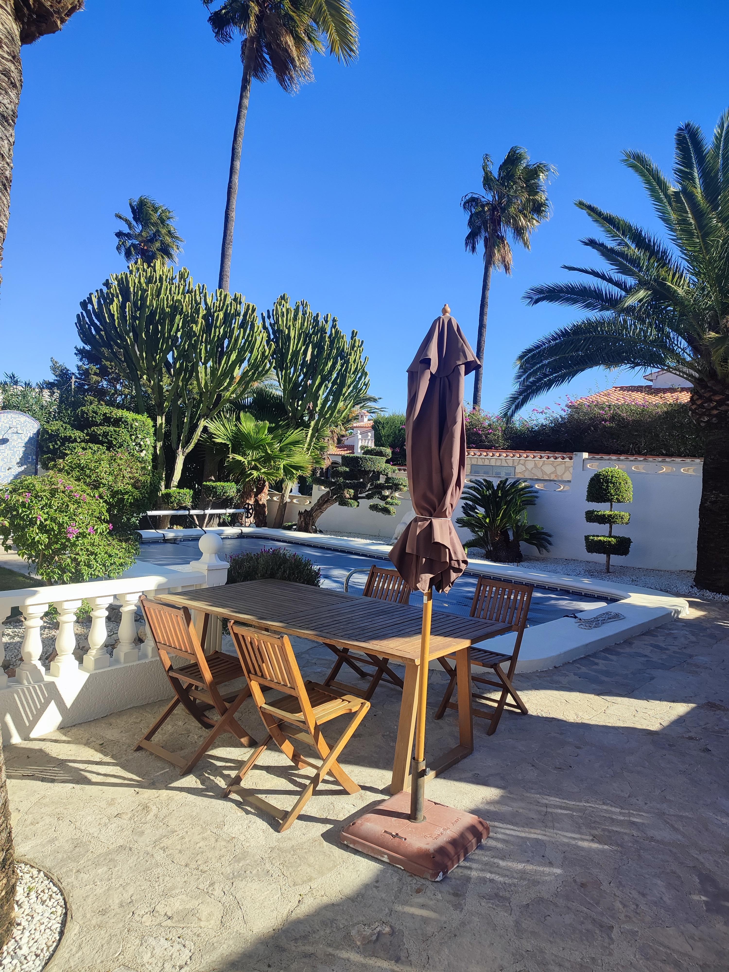 Villa on noin 130 m2. Omaisuus on täysin suljettu ulkoseinällä ja automaattisella portilla. Kokonaispinta-ala on noin 850 m2. Puutarha pidetään viikoittain, uima-allasalue ja poreallas riippuen säästä ja tarpeista puutarhuri ja talonmies. Siinä on 8 x 4 metrin oma uima-allas ulkosuihkuineen. Lisäksi kattoterassilla on poreallas, jossa on 3-4 paikkaa. Lisäksi huvilassa on käytännöllinen kesä / ulkokeittiö, jossa on pesuallas, jääkaappi ja kaasuliesi. Villaan katolla on suuri terassi, jossa on kauniit merinäköalat ja vuoristomaisemat. Lisäksi sillä on katettu autopaikka ja erillinen pääsy pesutupa, jossa on pesukone ja kuivausrumpu.