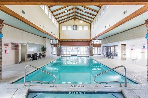 Huoneisto, jonka tarjontaan kuuluu sisäuima-allas ja kauden mukainen ulkouima-allas