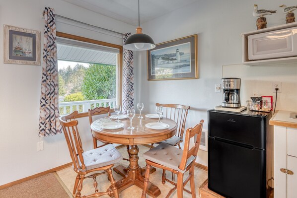 Experience the quiet beauty of Depoe Bay at this suite at Trollers Lodge! The Beacon is a studio unit with a kitchenette (no cooktop/oven) that has a microwave, mini refrigerator, Coffee maker and a toaster. The unit also has a flat screen TV with cable, and a small desk area for those that may need to bring along work.