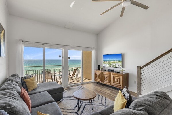 Searching for a well-appointed two bedroom condo with a balcony that overlooks the emerald jewel toned waters of the glistening gulf and its sugar white beach? Your search is over! Crystal Sands 314A, a beautiful two-bedroom unit that can comfortably accommodate up to 8 guests. The spacious Master Bedroom features a cozy king-sized bed and an attached full hall bath. The open living area boasts a sunny, spacious atmosphere with a wall of sliding glass balcony doors that showcase the breathtaking view of the sea. The high vaulted ceiling, open staircase, and loft area create a bright and airy setting with abundant natural light. The upstairs guest quarters include a lovely loft bedroom with a king sized bed and a flat-screen TV for evening entertainment. Adjacent to a full bathroom with a tub shower combination is a separate bedroom with two twin-sized bunk beds, perfect for kids.