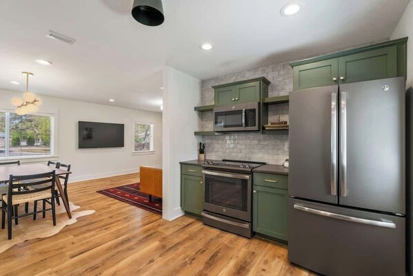 Explore the expansive living room before immersing yourself in the fully-equipped kitchen, adorned with stainless steel appliances and granite countertops, providing ample space for crafting delightful home-cooked meals.