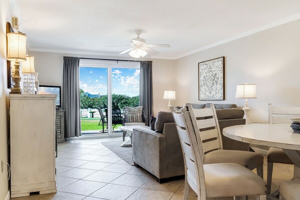 Nauti pohjakerroksen patiolta, josta on näkymät uima-altaalle ja shuffleboard-tuomioistuimelle.