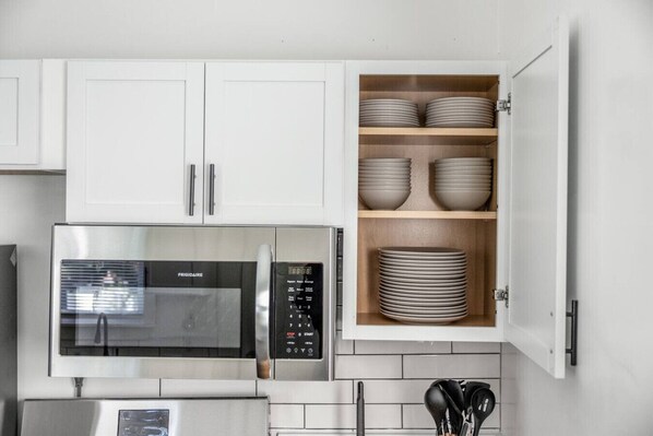 A shared full bathroom includes a tub/shower combination and ample cabinet space with room for your toiletries and extra bath linens.