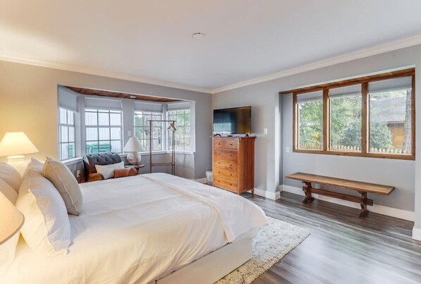 Inside, you’ll find warm wood tones, soaring ceilings, and thoughtfully chosen modern furnishings that blend beautifully with the home’s vintage bones. The fully stocked kitchen makes dining in a breeze, whether you're brewing your morning coffee or cooking a full meal after a day on the course or at the beach.