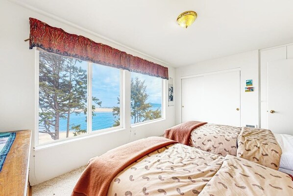 Soak up the spectacular 180-degree view where the Pacific Ocean meets the Alsea Bay and bridge as you slip into the coastal mindset here in Waldport! In addition to the water views, an abundance of wildlife will accompany you on this vacation, so bring your own binoculars (BYOB) and look closely! You may see seals, bald eagles (varying ages) in trees, osprey, herons, seagulls, cormorants, vultures, and pigeon guillemots. After fun days of exploring the local shops in town or walking along the sand nearby, kick back in the living room as the chef of the group whips up something tasty in the full kitchen. There is plenty of fun to be had with loved ones with the TV, free WiFi, and dining table that is perfect for hosting game nights. There is one bedroom and one bathroom downstairs, and two bedrooms and one bathroom upstairs, allowing everyone to experience convenience and comfort throughout their stay.