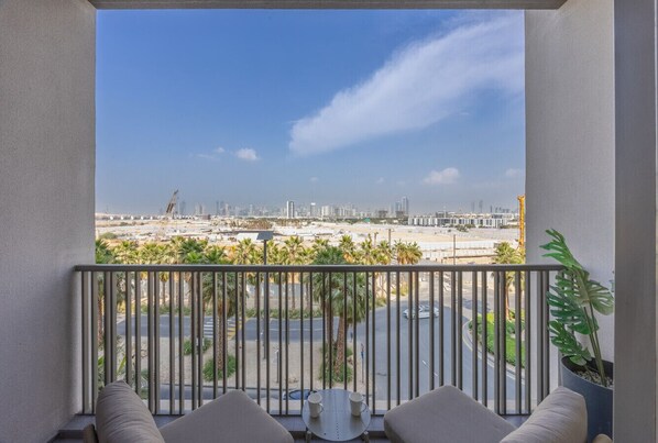 - Balcony with city skyline view and a Burj Khalifa view in the distance