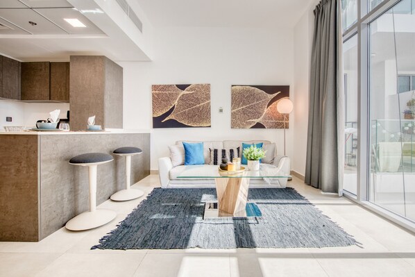 This modern 1-bedroom holiday home is nestled in one of the coziest parts of town – Jumeirah Village Circle. The spacious setting is aesthetically curated with high end furnishing, minimalist décor and a sleek layout. Guests can now lounge in the airy glass-walled balcony equipped with outdoor furniture, overlooking the serene community. The suburban getaway is also equipped with A-Z appliances, powder room and all-inclusive bills to ensure your stay is hassle-free.