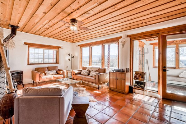 Upon arrival, you'll notice the cheerful exterior and breathtaking surrounding landscape. Walk inside and be greeted with thoughtfully curated art, furnishings, and southwest-inspired decor. The main living area features classic saltillo tile, adobe walls, plush leather seating, big mountain views, a freestanding gas stove, and a TV. The newly remodeled gourmet kitchen has an adorable breakfast bar with ample counter space and all the essential equipment you could possibly need to cook up and serve memorable meals. A large pantry provides additional storage and functionality to this perfectly appointed chef’s kitchen. The primary bedroom has stylish furnishings and a spacious layout, complete with a desk area. The additional bedroom has modern styling, great storage, and fantastic mountain views. A washer/dryer adds convenience, while the dedicated private office/studio space offers more great views to inspire all your creative and professional endeavors. The updated bathroom features tall ceilings, new fixtures, and beautiful tile work.