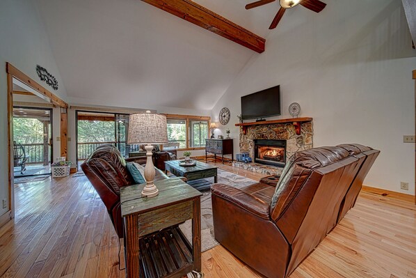 Come make everlasting memories at this beautiful home that sits on the Ellijay river! It features a huge wrap around, screened in porch, with a hot tub, Weber grill, 2 rocking chairs, and dining seating for 6. It’s perfect for enjoying your coffee in the morning or your wine in the evenings. There’s also a paved fire pit for you to enjoy at night.