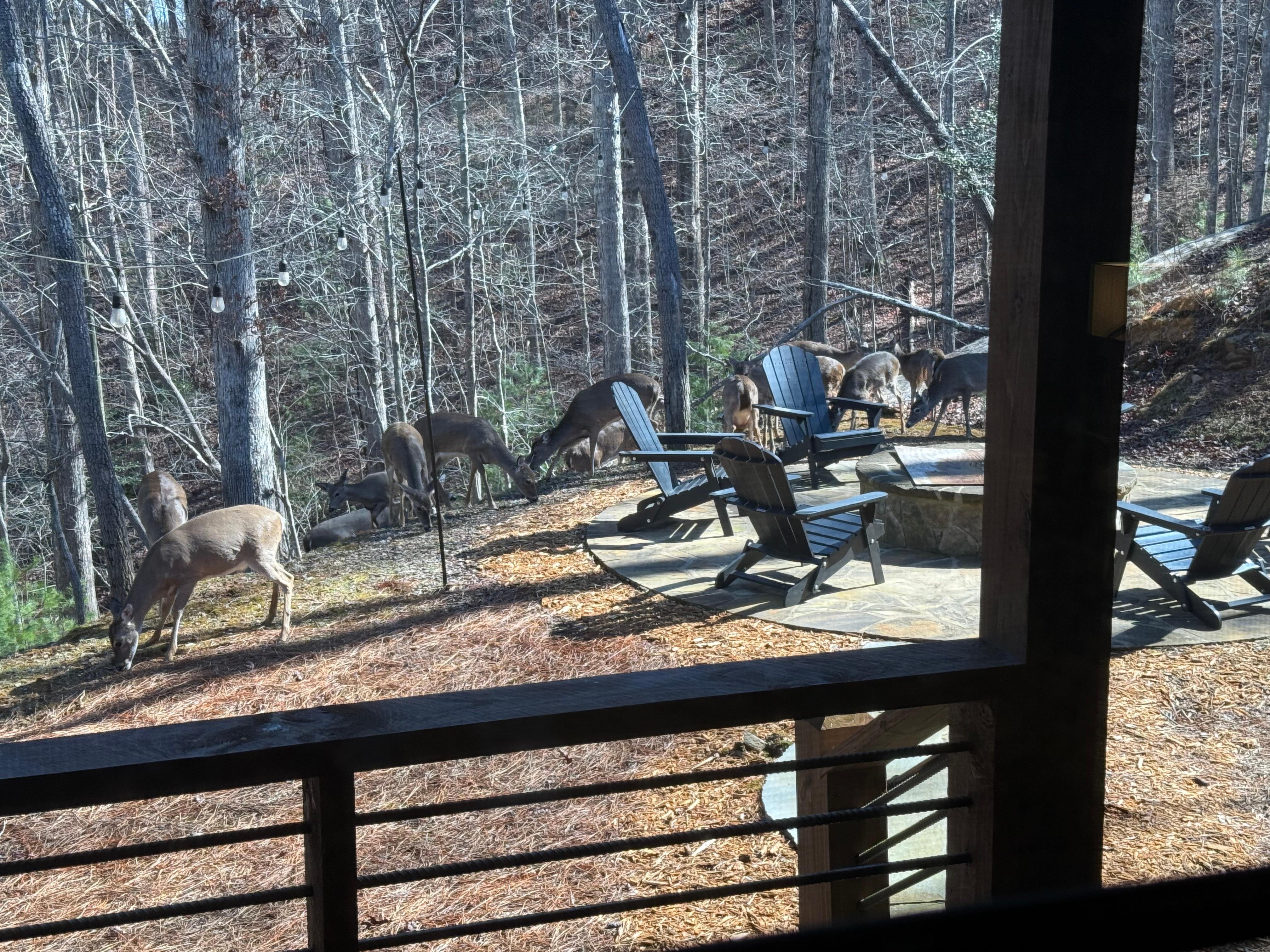 The first view of the cabin is wonderful. There is ample parking for more than one vehicle. The front porch is inviting and entry is a breeze. Two large bedrooms on opposite sides of the cabin. Each has its own private bathroom. The main room is cozy with a gas fireplace, then an oversized island for gathering and chatting while prepping meals in the kitchen. All appliances are modern. Full laundry. Through the kitchen is the entry to the back porch. Equally inviting with a table for eating outside, a gas grill for cooking. Then you make it to the firepit! Awesome. Surrounded by Adirondack chairs. There are two bucks, a prong horn, and a 6-point that are in the company of about 8 does that frequent the property to nibble on the freshly seeded lawn. Awesome and relaxing getaway. Thank you for sharing your home with us!!