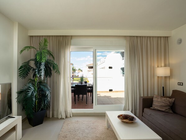 "Cortijo seastar", 3-huoneen huoneisto, 106 m2, suunta etelään. Vaalea, erittäin mukavasti ja kauniisti sisustettu: olo/ruokailuhuone, TV, ilmastointi ja ilmalämmitys. Uloskäynti terassille. 1 huone, 1 kapea parisänky (180 cm, pituus 200 cm), kylpy/WC ja kaksoispesuallas (yksityinen) ilmastointi ja sähkökäyttöinen ulkokaihdin. Uloskäynti terassille. 1 huone, 2 vuodetta (105 cm, pituus 200 cm), ilmastointi ja ilmalämmitys. Keittiö (uuni, astianpesukone, 4 keraaminen keittotaso, leivänpaahdin, vedenkeitin, mikroaaltouuni, pakastin, kahvinkeitin). Kylpy/WC. Terassi. Terassikalusteita. Näkymä uima-altaalle ja puutarhaan. Käytettävissä: pesukone, silitysrauta, syöttötuoli, lastensänky, hiustenkuivaaja. Internet ( Langaton LAN [WLAN] , ilmainen). Pysäköintipaikka n:o 58, autotalli. VUT/MA/92420 // Reg. Nr.: ESFCTU0000290370004872460000000000000000VUT/MA/924200