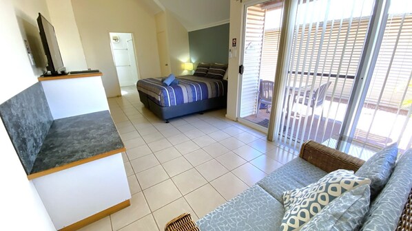 Täysin varustetussa studiohuoneistossa on kävelymatka CBD-alueelle, jossa on uima-allas monimutkaisesti ja joka mahtuu kaksi mukavasti king-size-vuoteella ja suurella kylpyhuoneella. Huomioithan, että tätä huvilaa ei huolleta, ja siinä on hyvin rajalliset ruoanlaittovälineet, kuten mikroaaltouuni, vedenkeitin ja Webber-vauva Q grilli. Huomaa, että tämä on yhdistetty yksikkö ja pääsee siihen vain vasemmalla puolella. Liinavaatteet ja pyyhkeet tarjoavat BYOn rantapyyhkeitä, anteeksi ei lemmikkejä tai tupakointia sisällä. Pesula on saatavilla pääostoskeskuksessa.