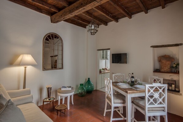 Huoneisto on valoisa ja hiljainen, ja oleskelutila avautuu viihtyisään olohuoneeseen, jossa on holvikatto, mukava sohva, ruokapöytä ja lipasto.