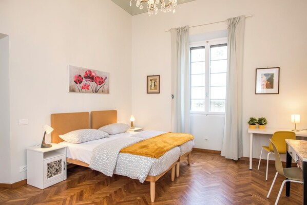The apartment is situated on the second floor (no elevator) of a typical Florentine building. It consists of three spacious double bedrooms, with the option to arrange them as double or twin beds, two shared bathrooms with showers, and a large living area featuring a lounge, dining table, and fully equipped kitchen.