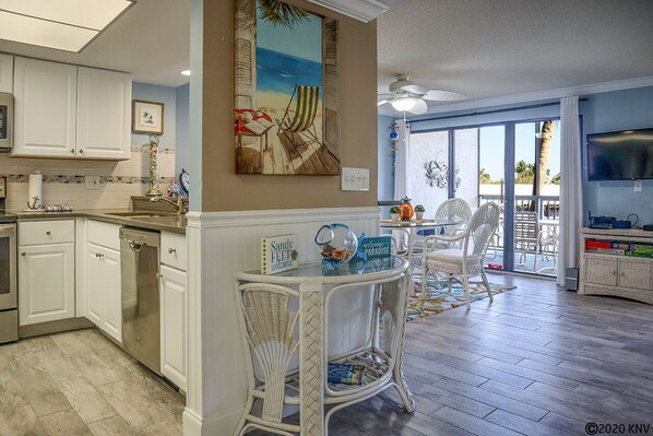 The fantastic, newly remodeled kitchen boasts all new appliances and is fully equipped with dishware and cookware to prepare all your meals. All has been custom designed with quartz countertops and a wonderful breakfast bar and bar stools to accommodate two. This modern kitchen includes refrigerator/freezer, range, microwave, coffeemaker, and dishwasher. The dining room is just off the kitchen with a table for four and a beautiful view from the sliding glass doors.