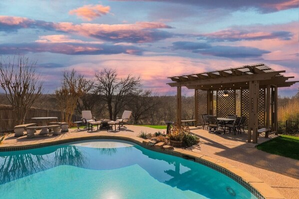 Fenced In Backyard Located by the creek huge Pool Area with Outdoor kitchen, Lounge Chairs, dining area With a Mini Seating Area Around a Fire Pit.