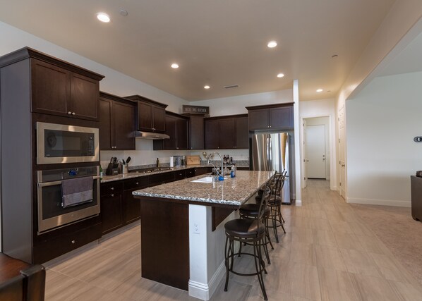 The modern kitchen includes everything needed for quick breakfasts, full meals, or extended stays: