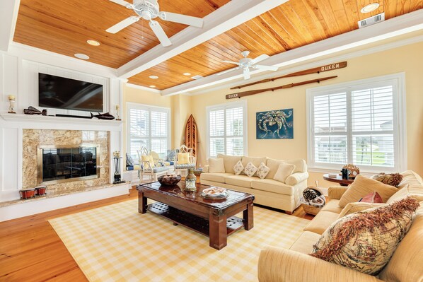 Inside, the main level welcomes you with an open living space filled with natural light from a wall of windows and plenty of comfy seating for movie nights or morning coffee chats. The spacious kitchen offers tons of counter space, a large island with a beverage fridge, and breakfast bar seating for six. Just beyond, the dining area seats eight comfortably, creating a great space for shared meals after a day at the beach. The main level also includes a queen bedroom, a full bath with a walk-in shower, and access to a partially covered deck with a private hot tub—ideal for relaxing under the stars.