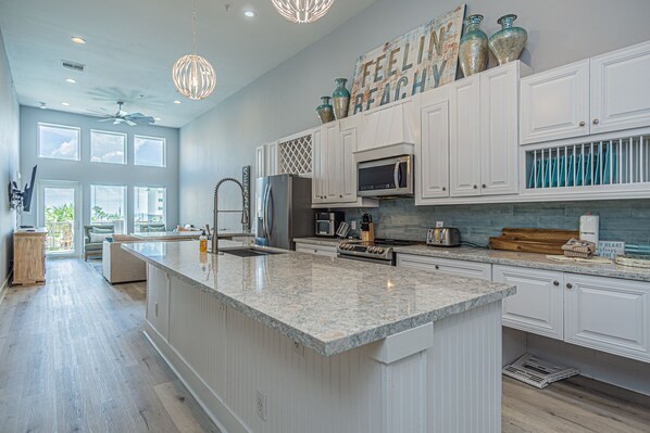 Enjoy fantastic views from this sister condo to the Dancing Mermaid, perfect for large family and friend gatherings. The unit features an in-unit washer and dryer, coastal-inspired décor, and comfortably accommodates eight guests with two king-sized beds and overhead twin beds (bunks) in the secondary bedroom. The beautiful, open kitchen includes a breakfast bar and is fully equipped with full-size appliances, including a wine rack. The kitchen is also stocked with dinnerware, pots and pans, glasses, coffee makers (both drip and Keurig), and cooking utensils. Please note that there may be some variations in furnishings or decor since the photographs were taken.