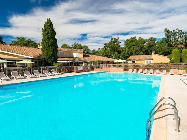 At Mazets Zomeno in Gaujac, enjoy shared amenities including an outdoor pool, children's pool, playground, and garden. The property offers 10 shared parking spaces onsite.