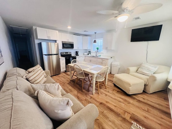 Inside, the fully equipped kitchen is a chef's delight, featuring a gas stove, microwave, Keurig coffee pot, and all the necessary cookware and utensils. The living area is designed for relaxation, complete with streaming TV for your entertainment needs. For added convenience, the duplex includes central air conditioning, a washer/dryer, and fresh linens and towels provided for your stay.