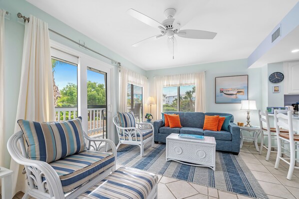 We absolutely loved this condo. It had a low key charm that was exactly what I was looking for. No high rise building or over crowded beaches. The small but clean and quaint condo was just what I wanted for our family to enjoy quality time together in a sunny, happy atmosphere. We loved being on the ground floor and the view of the lush grounds and multiple pools was excellent. We loved dropping our beach stuff on the porch and not having to drag it through the condo. We enjoyed exploring all the various grounds and pools included within the large Plantation property - it was nice there was a restaurant, bar, ice cream and coffee shop all on site. And right next door was the Beach Club food truck round up and activities for the kids in the evenings! And I can’t forget to mention the beach access. The boardwalk was picturesque, and not too long like some places. The beach had plenty of space to set up and the sand and water were gorgeous. Everything about this place was perfect for my husband, 10 year old, 3 year old and me. We will definitely be back!