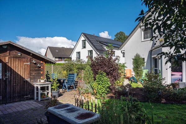 A cozy attic apartment (approx. 45 sqm) on the 1st floor. It is perfect for a couple or to share with 2 friends/colleagues. There is 1 bedroom and 1 living room, which can be used as a 2nd bedroom. There is a comfortable sofa bed with a proper mattress and slatted frame (1.30x2m). There is also a shower room, a kitchen area with dining area. A dishwasher is available as well as a vacuum cleaner. For children there is a crib with bed linen and a high chair. These are available on request. Children's crockery is available in the apartment.