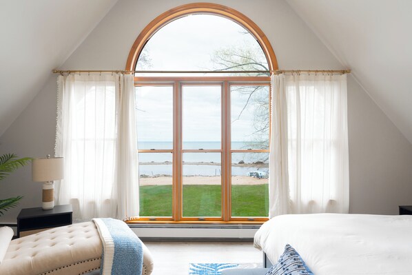 Spectacular views with more than 150 ft of unobstructed beach shoreline on private 5 acres, make for a great family reunion destination. There are two primary suites, one on the main floor and ADA compliant, and the second upstairs with a wall of windows overlooking gorgeous Lake Huron and features a spa-like primary bath. The other three bedrooms have a king, a queen, and the final room provides great flexibility with 2 full size beds and a pair of twin trundles with plenty of room for games and play. The open floor plan allows for plenty of room to dine and entertain all of your family and friends. You will enjoy a fully equipped kitchen, modern and comfortable furniture designed for everyone, and stunning lake views throughout the home. Outside, the patio offers a great space for entertaining and is the best spot for a coffee at sunrise. The large yard allows for an entertainment tent and all of the games kids can play. The private lagoon offers easy access for kayaking and paddle boarding. Here, you are just minutes away from the Harbor Beach Marina and Lighthouse and a short drive to so many charming towns and festivals around the Thumb Coast.