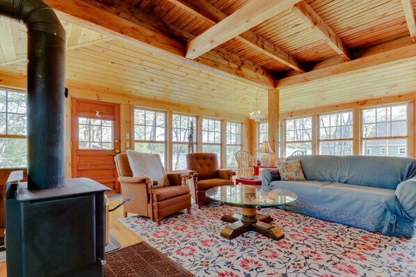 Astu sisään löytääksesi puulattiat, oksaiset mäntypalkit seinillä ja kattoissa sekä WiFi koko kodissa. Rentoudu sohvalla uudella, lämmitä puuhella edessä, ihaile kiinteistön näkymiä isoista ikkunoista tai valitse DVD-kaapeli-TV.