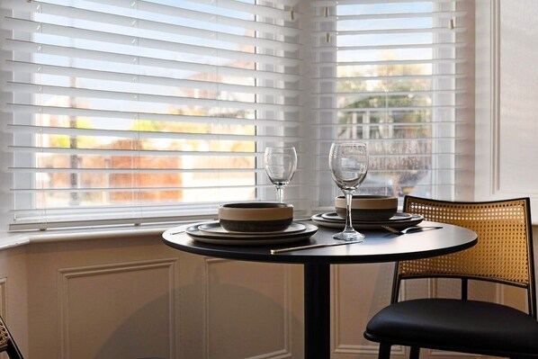 The dining table seats up to 2 people and is ideal for a sit-down meal in the evening.