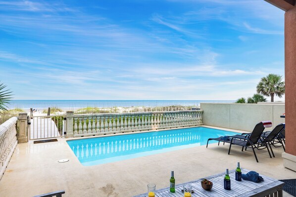 Upstairs, multiple bedrooms feature balcony access—three of them with direct views of the sea. Wake to the sound of waves, breathe in salt air, and feel your shoulders drop as you step outside to the rhythm of island life. The private pool is tucked perfectly between the home and the sand dunes, so you can float, sunbathe, or simply gaze out at the surf with nothing but a horizon in front of you.