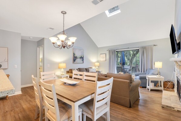 The open living area offers even more room to relax, with comfortable couches—including a sleeper sofa—where guests can unwind after a fun-filled day on Hilton Head Island and enjoy a movie on the flat-screen TV. For added convenience, the villa also includes an in-unit washer and dryer, making it easy to keep beachwear fresh throughout your stay.