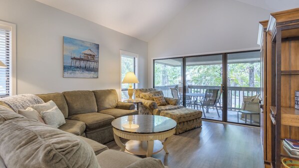 Feel free to enjoy your morning coffee on the cozy outdoor balcony, overlooking the beautiful surroundings. This villa is also steps away from the beach and the bicycle path, making it perfect for a family vacation, golf group outing, or weekend getaway.