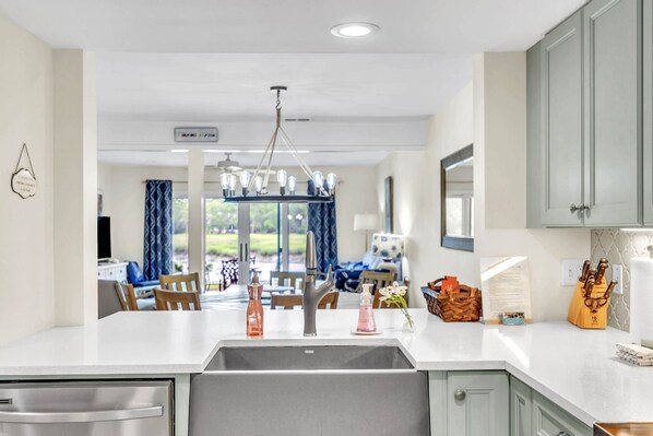 This gorgeous 3-story villa has simple, coastal elegance throughout! The first floor has been completely remodeled, starting with beautiful and durable vinyl plank flooring. The kitchen is a soft and bright space with quartz countertops, stainless steel appliances, farmhouse sink and lower cabinet drawers that all pull out for easy reach of cookware. The kitchen is adjacent to the laundry room which walks out to the private, dual-headed outdoor shower. You will only want to shower outside!