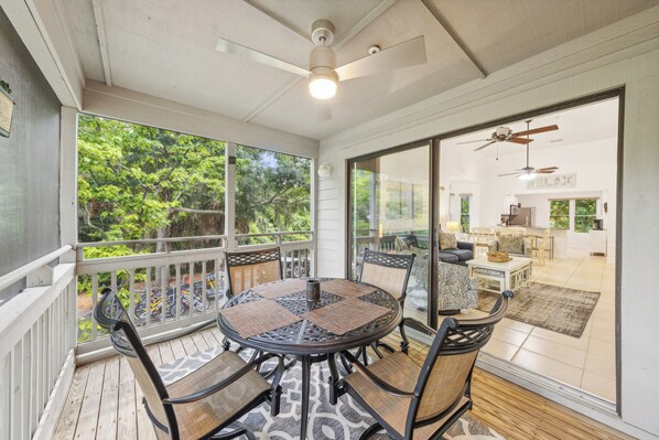 ✓ Serene covered screened patio with wooded views and seating for 4