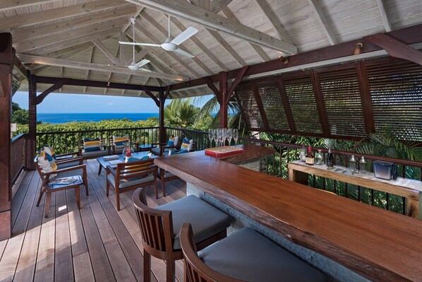 Tilavassa virallisessa olohuoneessa on käsintehdyt balilaiset kivihelmet ja se avautuu ulkoterassille, jossa on suuri infinity-allas ja keskeytymättömät näkymät Karibianmerelle. Kun Tom Tomin uima-altaaseen on valaistu yöllä, se muuttuu maagiseksi yksityisympäristöksi, joka sopii erinomaisesti cocktailien, keskiyön uimisen tai stargazingin illalle. Avoin suunnitelma, hyvin varusteltu keittiö kulkee terassilla sijaitsevaan ruokailutilaan ja tarjoaa ulkoilmaruokailusta upeat näkymät. Terassilla on myös grilli, jossa on enemmän rento kulinaarisia hetkiä!