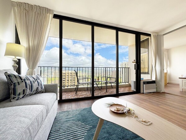 Step into this partially renovated 600 sq ft one-bedroom condo on the 18th floor of Waikiki Banyan and enjoy soothing mountain and city views that create a welcoming retreat after a day of island adventures. Just one block from world-famous Waikiki Beach, this inviting space places you within easy walking distance of dining, shopping, the Honolulu Zoo, and Kapiolani Park. The condo features a comfortable queen bed, window air conditioning, a 55-inch smart cable TV, free Wi Fi and parking, a full kitchen for easy home-style meals, and a bathroom with a tub and shower combo, making it a relaxing and convenient home base for your Waikiki getaway!