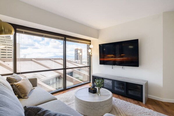 Experience Honolulu in style from our 15th-floor one-bedroom suite! Sleep soundly on a King bed or cozy up on the sofa bed, perfect for 4. Free WiFi and cable for endless entertainment. Walk to Walmart, Ross, and 7-Eleven. Dine at top spots nearby. Unwind in the large pool or jacuzzi. Free parking included. Seamless self-check-in with a combination code. Downtown vibes at your doorstep!