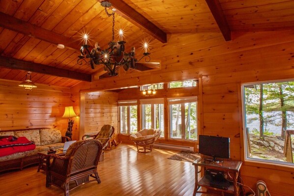 Mökin sisällä on henkeäsalpaava sisustus, jossa on oksaiset mäntyseinät ja katot sekä kovapuulattiat kaikkialla. Olohuone, jossa on suuret ikkunat, on hyvin avoin, ja sen keskellä on lattiasta kattoon ulottuva kivitakka, jossa on suuri Muskoka-mänty-ruokapöytä kulmaikkunoiden vieressä, josta on upeat näkymät järvelle. Suuri keittiö tarjoaa runsaasti tilaa työskennellessään aterioita perheelle. Kaikissa kolmessa makuuhuoneessa on puinen sisustus ja kerrossänky. Patjat ja tyynyt ovat melko uusia, laadukkaita, lujia ja mukavia. Näkymä kannelta on täydellinen nauttimaan aikaa suosikkijuomasi kanssa, juttelemalla päivän tapahtumista tai nostamalla BBQ: n yöksi.