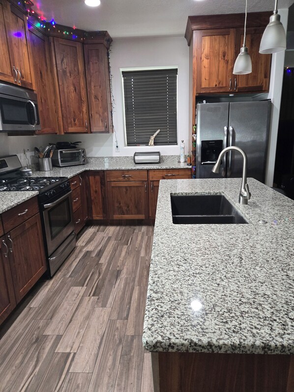 Located in Hurricane, this delightful house offers a serene escape for guests seeking comfort and relaxation. With two cozy bedrooms featuring a king bed and a queen bed, everyone can unwind in style. Two bathrooms include a jetted bathtub, perfect for soaking after a day of adventure. The cool interior keeps the space comfortable no matter the season. Guests will appreciate thoughtful touches like heating and AC to suit their needs. Whether you ’re here to relax or explore, this house provides a peaceful retreat. Only 10 minutes away from Sand Hallow State Park and 29 minutes away from Zion National Park. We’ll be available to answer any questions while you stay at our place.
