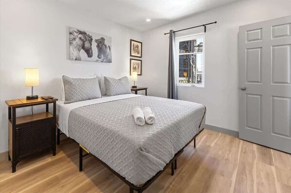 Kitchen: The fully stocked kitchen is equipped with everything you need to prepare meals, including complimentary coffee to start your mornings right. Bedroom: The bedroom boasts 1 queen bed with luxurious 12-inch thick mattresses. The bed is adorned with four pillows to ensure a restful night's sleep.