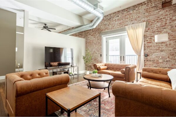Each unit is an exceptionally spacious one-bedroom apartment, thoughtfully designed to feel like home while still offering a polished, upscale experience. Guests enjoy a full kitchen ideal for extended stays, a large living room with two couches and a lounge chair, a 65” TV, and dedicated dining space with both a table and countertop bar seating. The bedroom features two queen beds, providing flexible and comfortable sleeping arrangements.